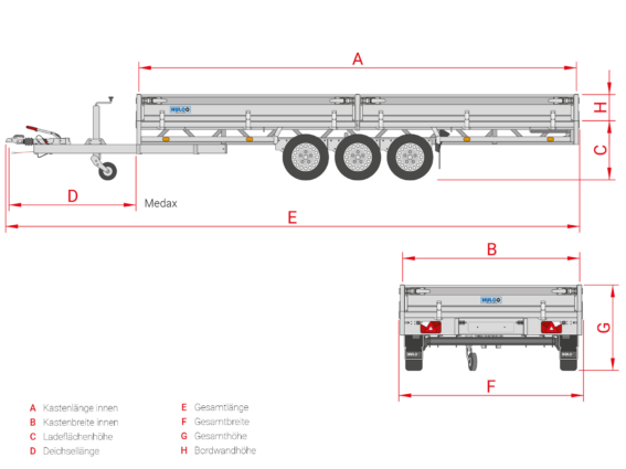 Hulco Medax-2 3000 611×203, plateauwagen met 2 assen, bruto laadvermogen 3000 kg.